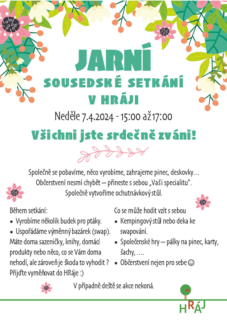 V neděli dne 7.4.2024 se koná Jarní sousedské setkání v HRáji, v čase 15:00 - 17:00.
